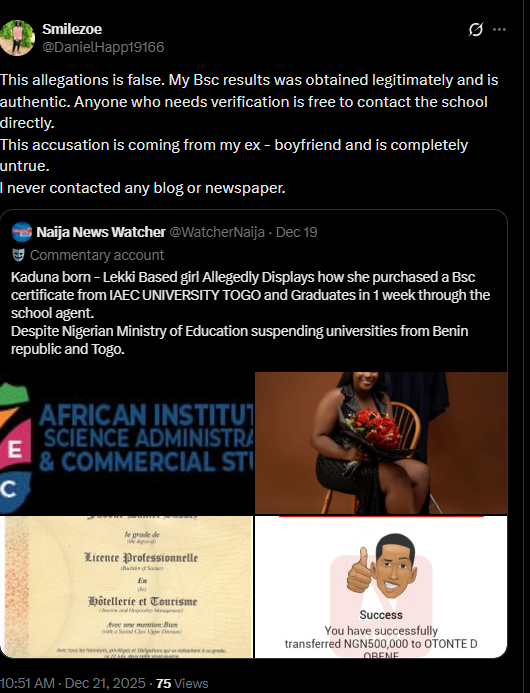 This allegations is false. My Bsc results was obtained legitimately and is authentic. Anyone who needs verification is free to contact the school directly. This accusation is coming from my ex – boyfriend and is completely untrue. I never contacted any blog or newspaper. – She claimes